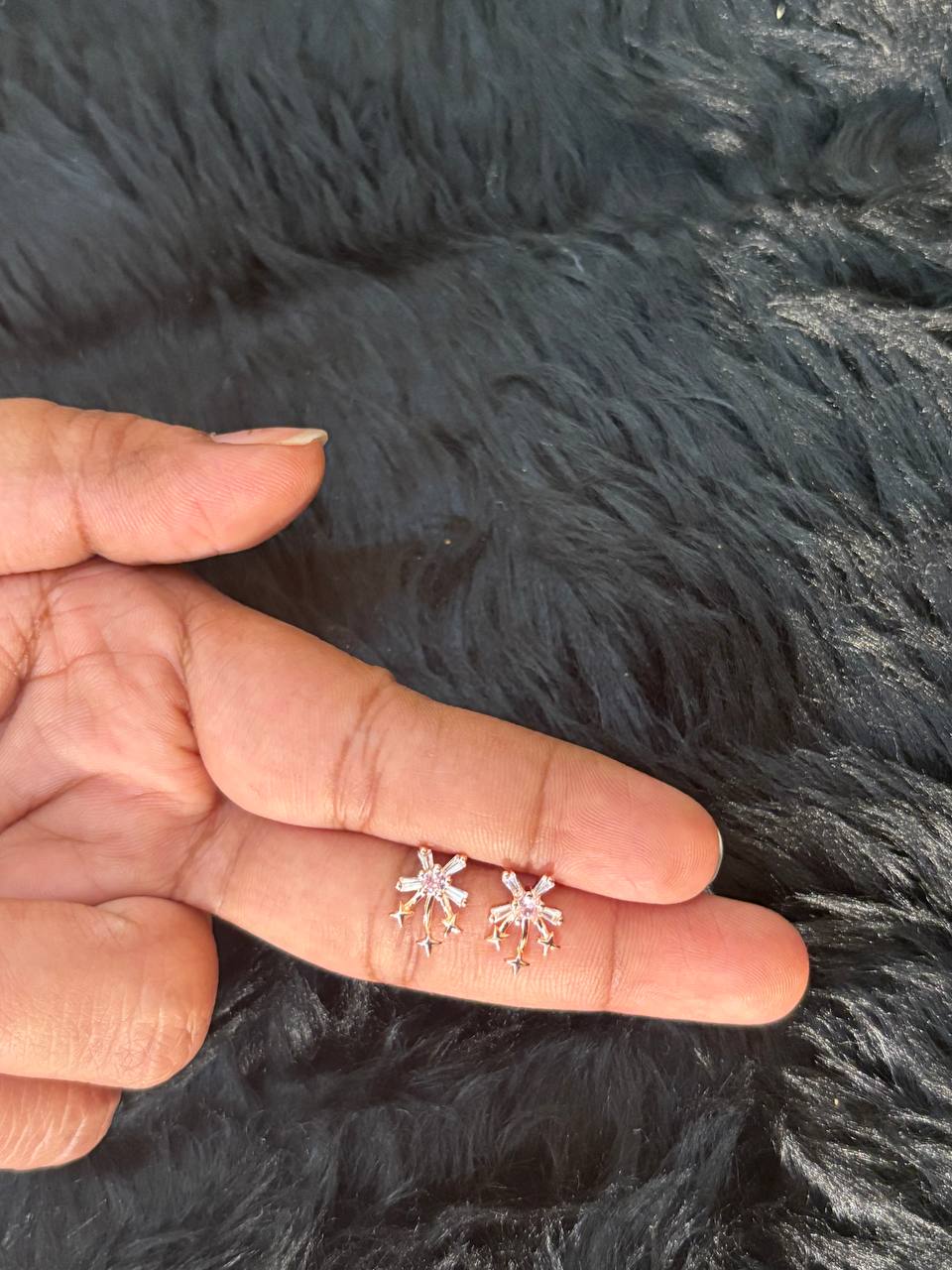 Delicate rose gold and silver studs styled like starbursts with shimmering crystal drops — adding celestial charm to any look.