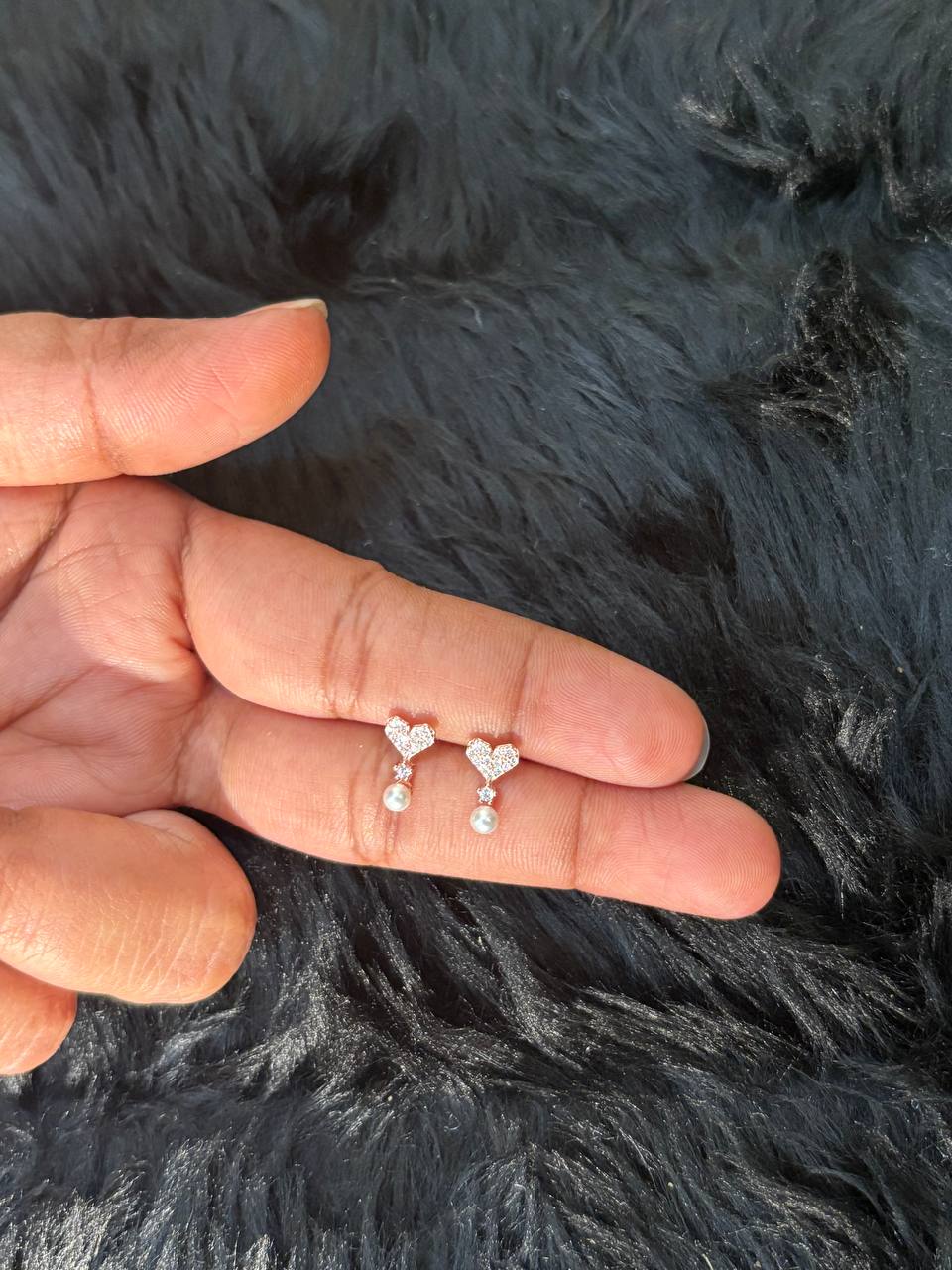 Romantic silver rose gold-plated earrings with sparkling heart-shaped tops and delicate dangling pearls—adding a sweet, elegant charm to your style.
